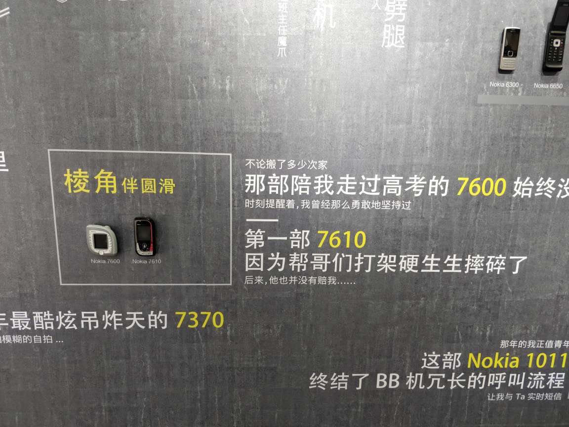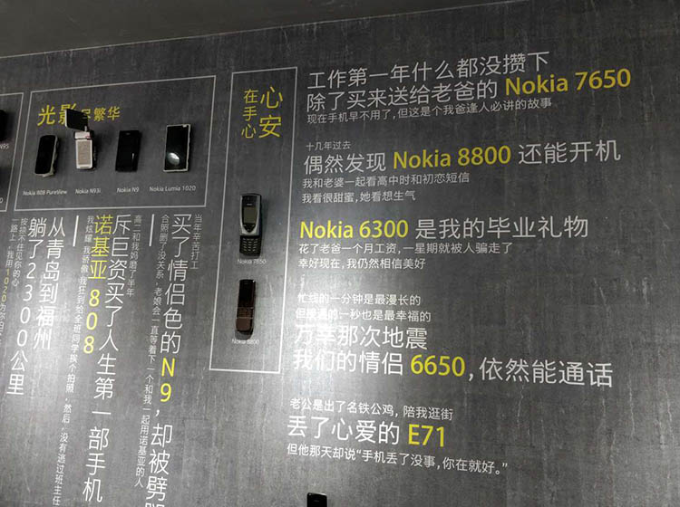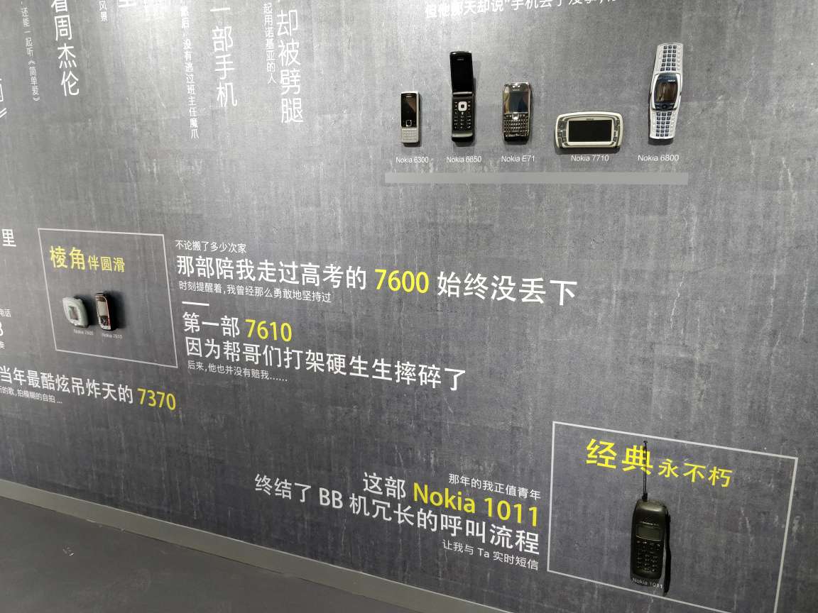 墙壁上放有一些经典款式的诺基亚手机,并且一旁还写有机主与这款手机的故事,看过之后很是感动。