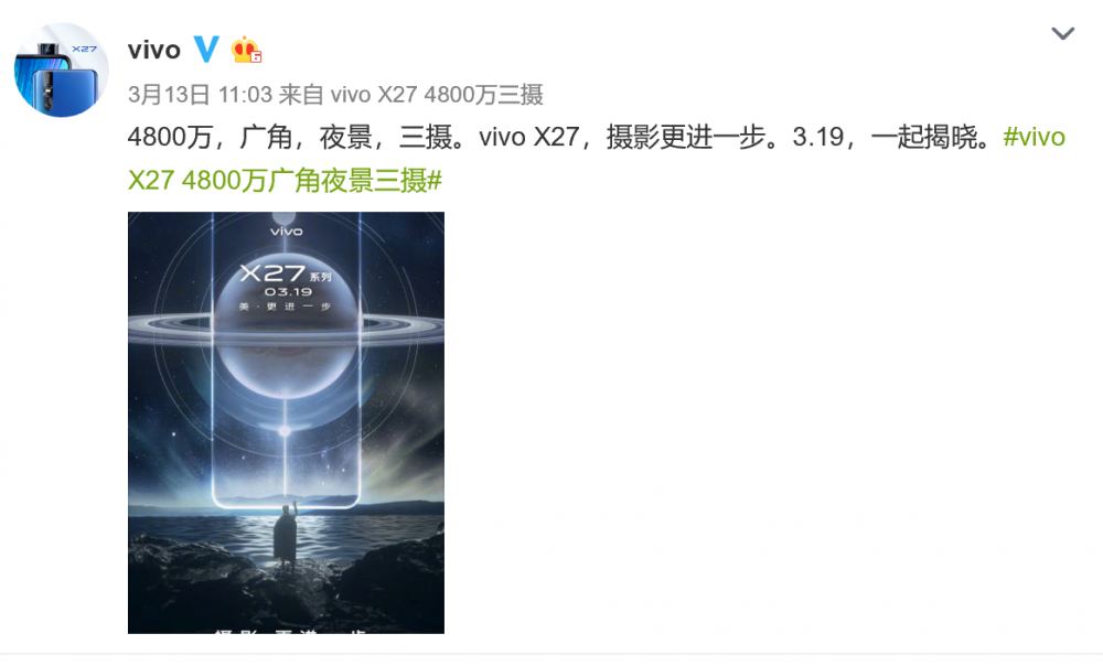 今晚19:30,vivo将在三亚推出新品手机x27,一款备受期待的全新拍照神器,官方宣传口味为“美?更进一步”!