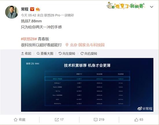 不过最大的亮点还是它的机身厚度,据说能在电池容量保持4050mAh的情况下,将机身厚度控制在7.88mm。比目前采用4000mAh电池的手机要薄上不少。常程还表示,联想Z6青春版挑战7.88mm,只为给你两天一充的手感。Z6青春版很科技所以超好看超能打。