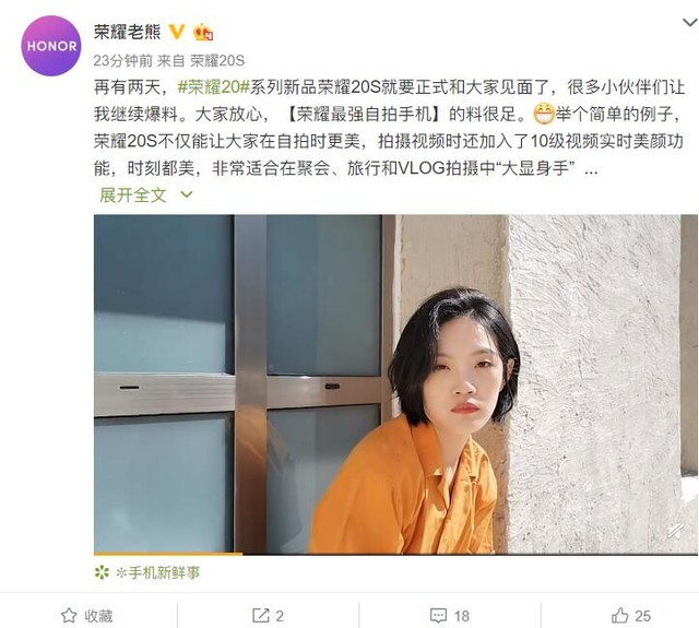 荣耀老熊爆料荣耀新机荣耀20S的最新消息,并附上荣耀20S的预热视频。荣耀20S拥有很强的拍照性能,它不仅能够让大家自拍的时候很美,在拍摄视频中荣耀新增的10级视频实时美颜功能,能让你时刻都美!