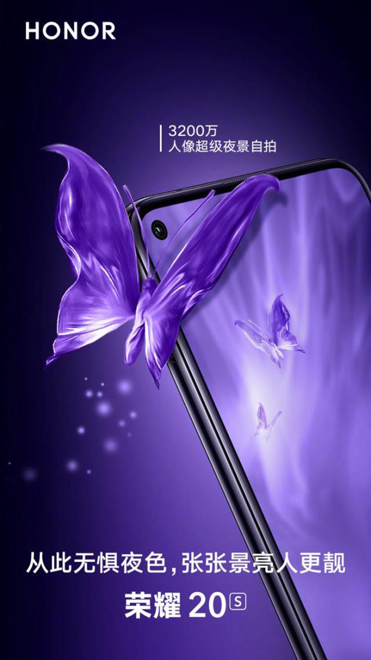 根据网上曝光的荣耀20S的真机图和曝光消息显示,该机会首次将“蝶羽纹理”引入手机背部,做出蝴蝶的光效。正面采用6.26英寸IPS屏幕,采用侧边指纹识别设计,核心配置上搭载麒麟810处理器,并拥有128GB和256GB两种存储空间可供选择,同时内置3650mAh电池,支持20W快充。