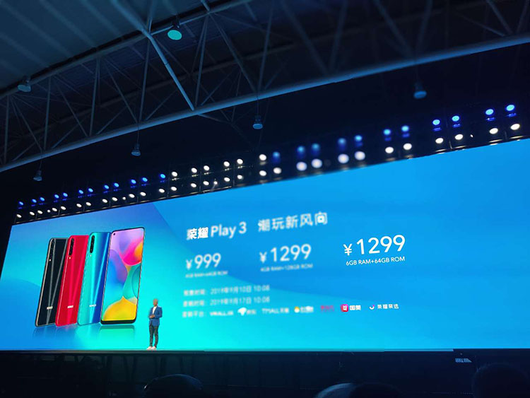 荣耀Play3定价,4GB+64GB:999元、4GB+128GB:1299元/6GB+64GB:1299元,9月17日首销。