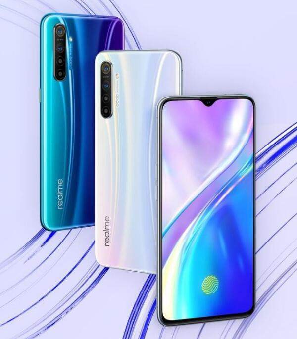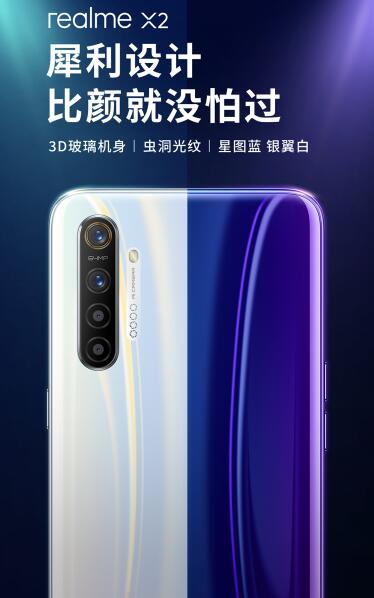 在配色方面,realme X2 提供两种配色,一种是银翼白,一种是星图蓝;外观方面,realme X2手机正面为常见的水滴屏,背面则是竖排摄像头
