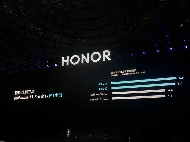 续航方面,荣耀V30电池容量为4200mAh,V30 Pro则是4100mAh,玩《王者荣耀》比iPhone 11 Pro Max要多出1小时以上。