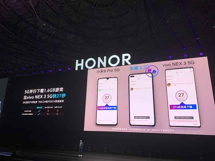 麒麟990同样让荣耀V30拥有更快的下载速度,同样的1.6GB大小的游戏,荣耀V30要比vivo NEX 3 5G快27秒。