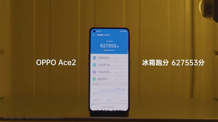 OPPO还开启实验室极致版冰封模式,将一部Ace2放入冰箱,结果跑出了627553分, 比普通模式高出了超过1.1万分!