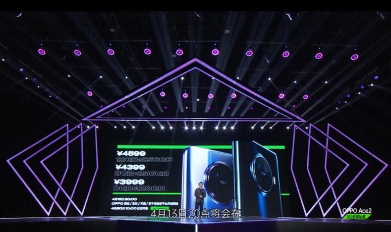 OPPO Ace2提供三种配色:月岩灰 梦幻紫 极光银,8GB+128GB为3999元、8GB+256GB为4399元、12G+256G为4599元,4月20日开售。