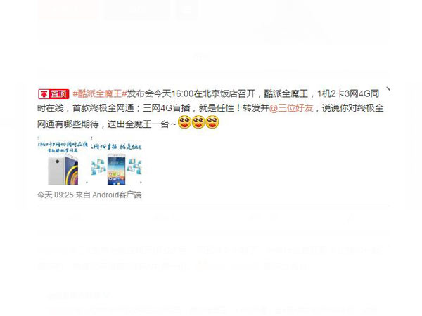 发布会将于今天下午16点正式开始,酷派官方微博现在也开启了一系列的预热活动。