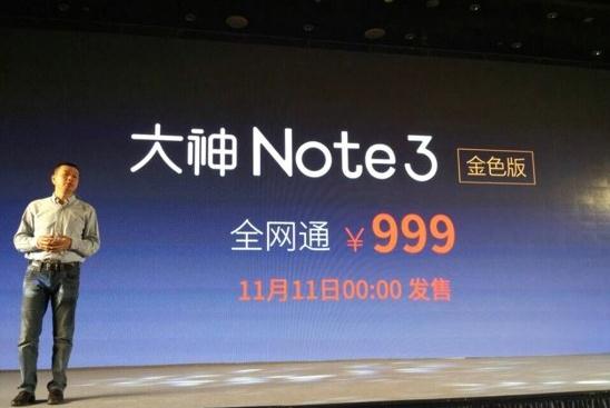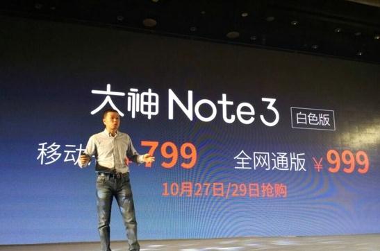 最后,售价公布:大神Note3金色全网通版售价999元,将于11月11日0:00正式发售;白色Note3移动版售价799元,全网通版售价999元,将于10月2729日展开抢购。