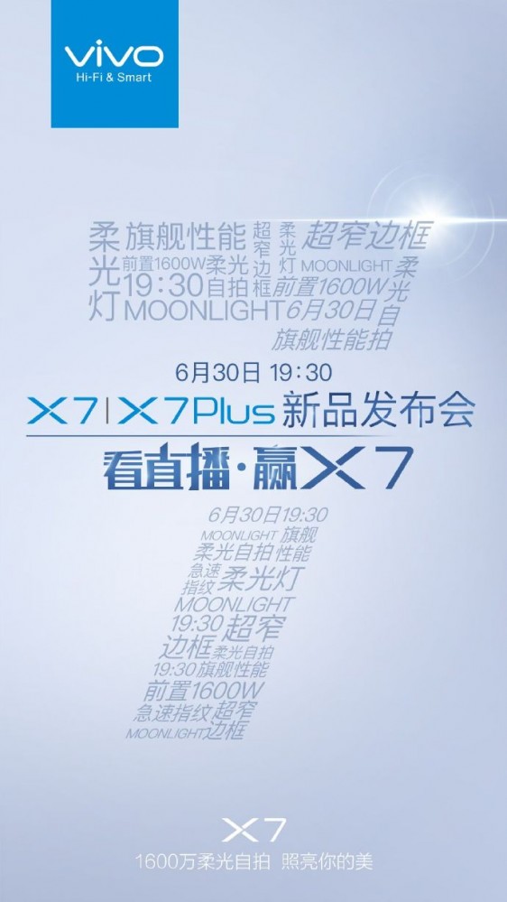 6月30日19:30,vivo将在北京?中国电影导演中心召开主题为”1600万柔光自拍照亮你的美“的发布会,正式发布vivoX7拍照旗舰。